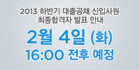 2013 하반기 대졸공채 신입사원 최종합격자 발표 2월 4일(화) 16:00 전후 예정입니다. 2014.01.28